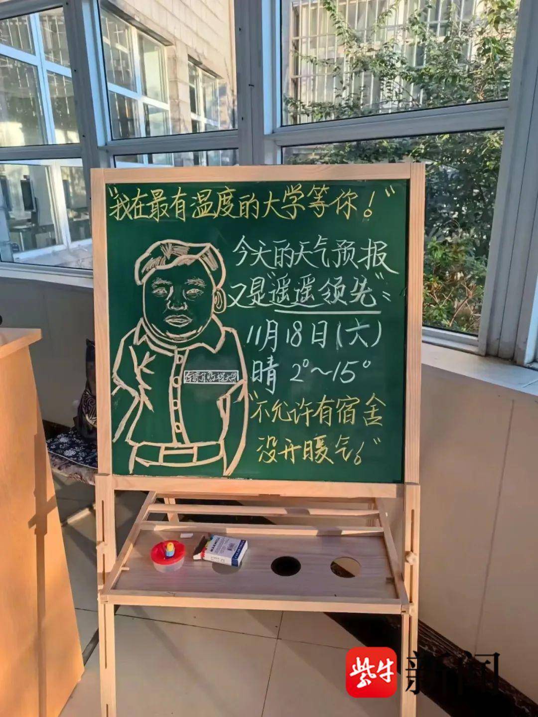 在南信大宿管站,宿管阿姨们给学生们送上了贴心提醒:“我在最有温度的大学等你,不允许有宿舍没开暖气。”这块写着温馨提示,并画上卡通配图的黑板报被学生拍下,在各大社交平台迅速刷屏,“好暖!阿姨的关爱时刻都在。”