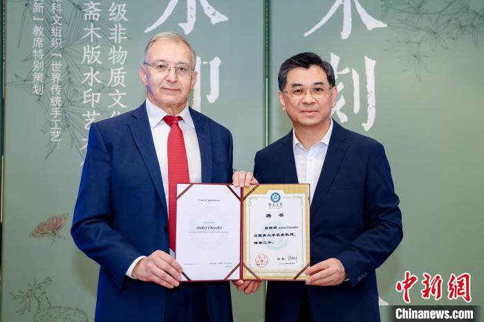 讲座前,暨南大学党委书记林如鹏为安德烈·切韦寥夫颁发了暨南大学客座教授证书。这是暨南大学继联合国教科文组织前任总干事伊琳娜·博科娃之后,再次聘请该国际组织的官员担任该校教授。