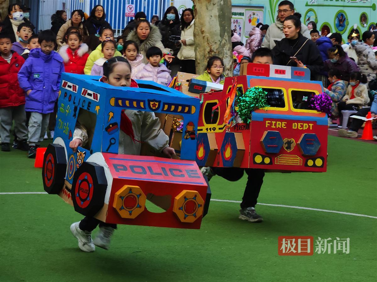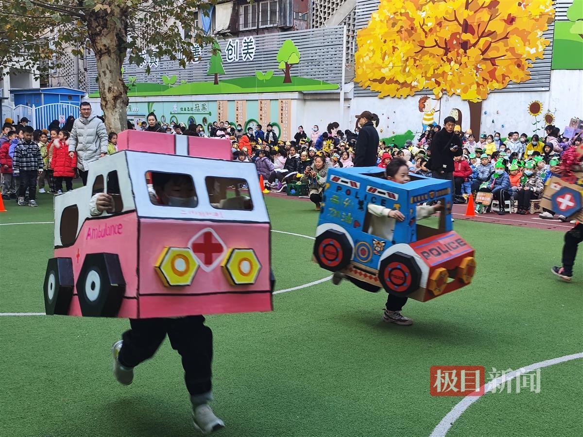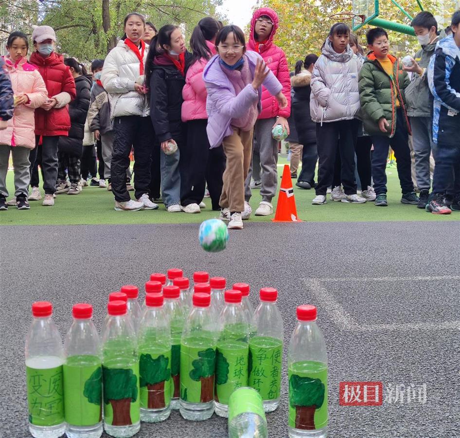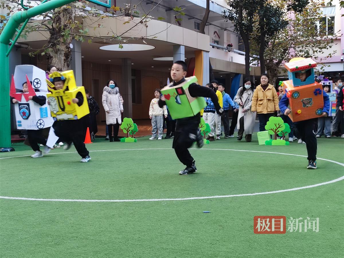 热情的呐喊声中,各年级运动员“盛装”亮相——装扮成“未来小汽车”的低年级同学开启动力拉力赛;“未来机器人”们你追我赶勇闯障碍通关赛;高年级同学自备保龄球“撞”出节能意识……仔细看,每个赛项中兼具未来感和趣味性的游戏道具,竟都来自同学们的独家创想和手工制作。