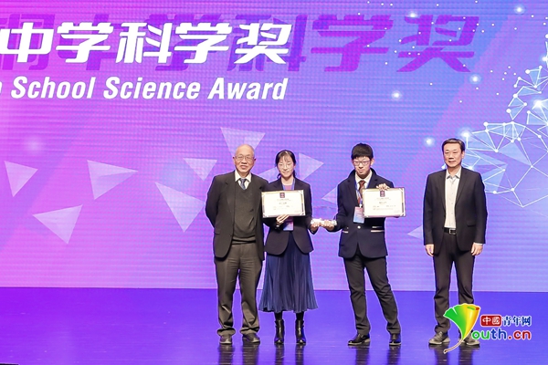 丘成桐(左一)、清华大学副教务长刘毅(右一)为科学金奖得主郁含章(左二)、晁楚言(左三)颁奖。