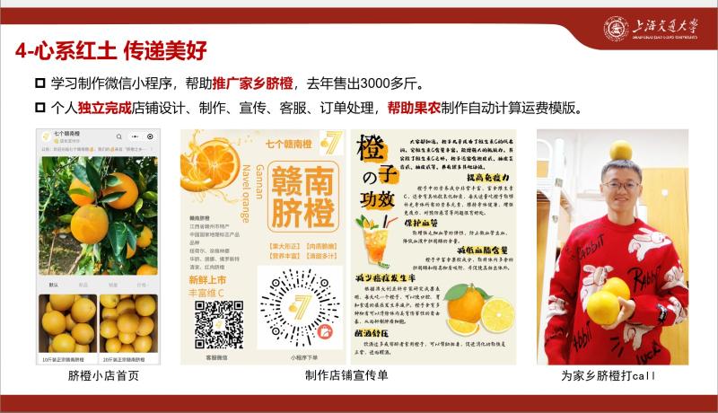 农业与生物学院2020级本科生。他是有温度的招生人,参与2023年录取通知书创意设计,“上海交大录取通知书里藏着一滴水”登上热搜第一;拍摄录取通知书开箱等多条宣传视频,屡登官微,累计观看量破百万;担任招协会长,总负责2024年“筑梦”返校宣讲。他是有才干的学工人,担任院系学生会、党建研究会主席,作为学生导演参与负责2023年“一二·九”合唱比赛等二十余项校级及以上活动,校史剧原创剧本《海菜花开》收获孔海南老师本人肯定,屡获嘉奖。他是有情怀的公益人,累计志愿服务时长五百余小时,两度带队社会实践,获评校级优秀团队、重点项目,聚焦社会热点。获校优秀学生干部等25项校级及以上荣誉。