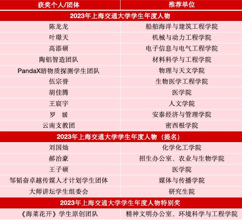 饮水思源,爱国荣校;志存高远,脚踏实地。上海交通大学学生年度人物展现的是新时代交大学子的精神风貌,彰显的是当之无愧的榜样力量,他们的事迹将继续指引每位交大人奋发向上,砥砺前行,以热忱书写青春,用青春告白祖国。