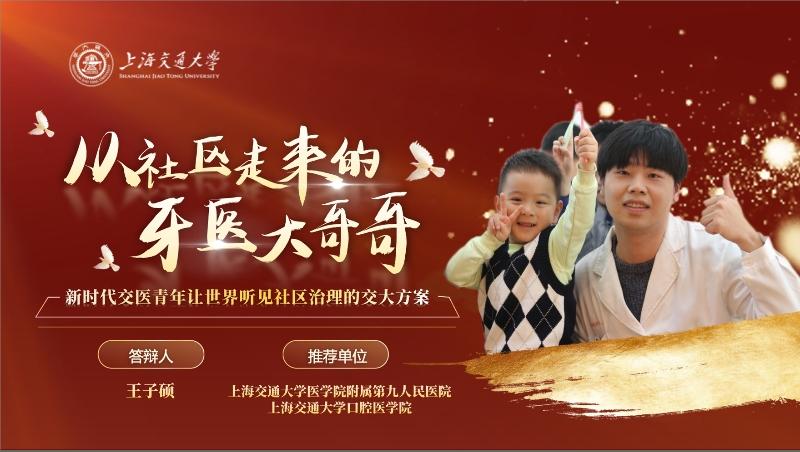 医学院2021级口腔医学硕士研究生。任医学院团委社会实践部部长团成员、“久蔚”诊室公益项目学生负责人、“白袍红心”博士生医疗服务团学生负责人。曾获评中国大学生自强之星、“知行杯”上海市大学生社会实践先进个人、交大年度志愿者等称号。积极参与健康大思政课,线上线下理论宣讲覆盖人数超十万人次,向时代传递交大人与社区健康治理的故事。打通了“医疗服务-科学传播-红色宣讲-社区情怀”的健康公益新链条,组织社区公益医疗服务活动百余场,累计服务时长超1000小时。曾获全国“三下乡”重点团队等20余个科研创新、社会实践、公益服务奖项。