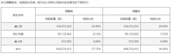 该笔捐赠股份来自非公开发行,本次捐赠将通过非交易过户方式完成。目前,绍兴韦豪持有韦尔股份9913万股,占公司总股本的8.15%。捐赠后,其持有公司股份比例将减至7.33%。控股股东及其一致行动人合计持有公司股份比例将从37.72%降至36.90%。