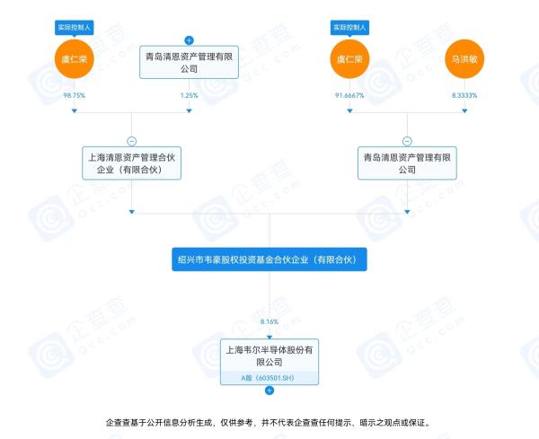 企查查数据显示,绍兴市韦豪股权投资基金合伙企业(有限合伙)成立于2017年12月,由上海清恩资产管理合伙企业(有限合伙)和青岛清恩资产管理有限公司合伙成立。实际控制人为韦尔股份董事长虞仁荣,其持有两合伙人股份分别为98.75%、91.67%。