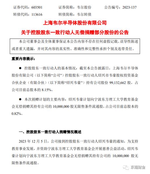 12月6日,韦尔股份发布公告,公司控股股东一致行动人绍兴韦豪计划向宁波东方理工大学教育基金会,无偿捐赠其持有公司的1000万股无限售条件流通股。