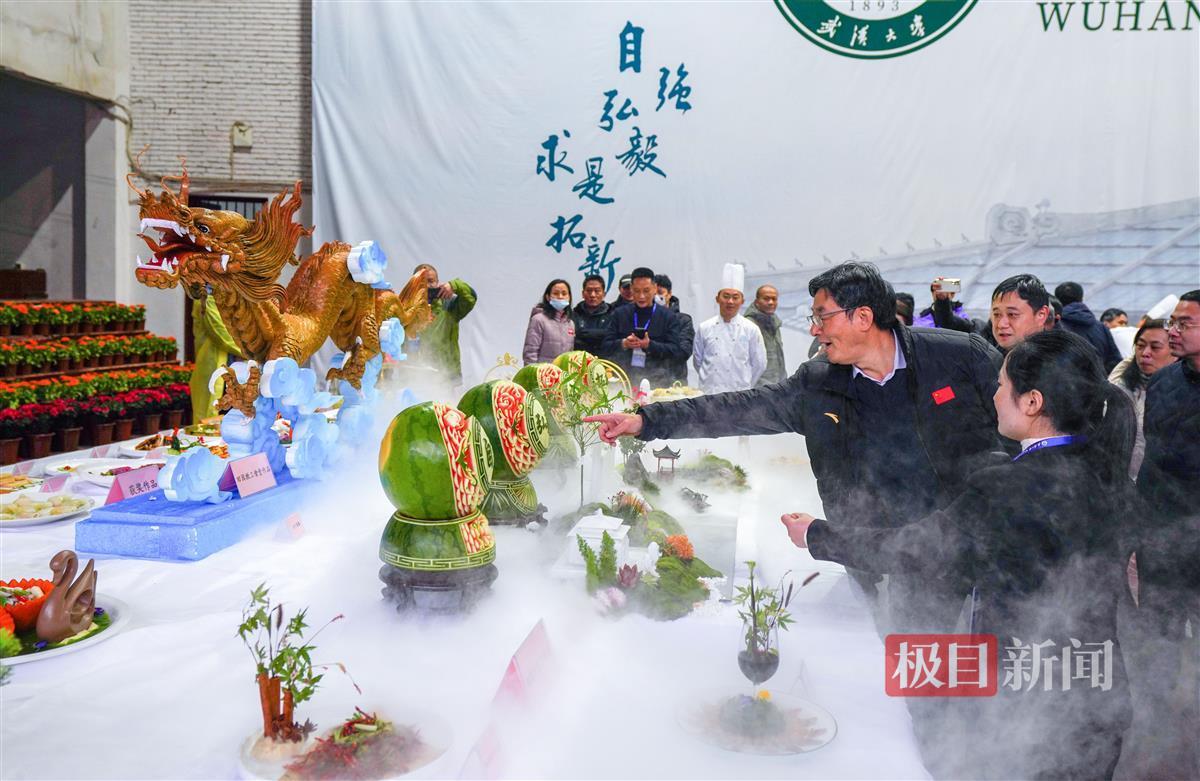 极目新闻记者注意到,不少项目都有“130周年校庆”元素。在饮食服务中心展台,名为“龙兴龘龘”的巨型龙形雕刻,苍劲有力,前方的四个西瓜雕刻有“自强”“弘毅”“求是”“拓新”的武大校训,充分体现了厨师的刀工;展示台上的咖啡都设计了武大130周年、武大校徽等特色拉花;在商品堆码区,自强超市的员工用上千瓶易拉罐饮料,复刻出了老图书馆和珞珈牌坊两大经典建筑。