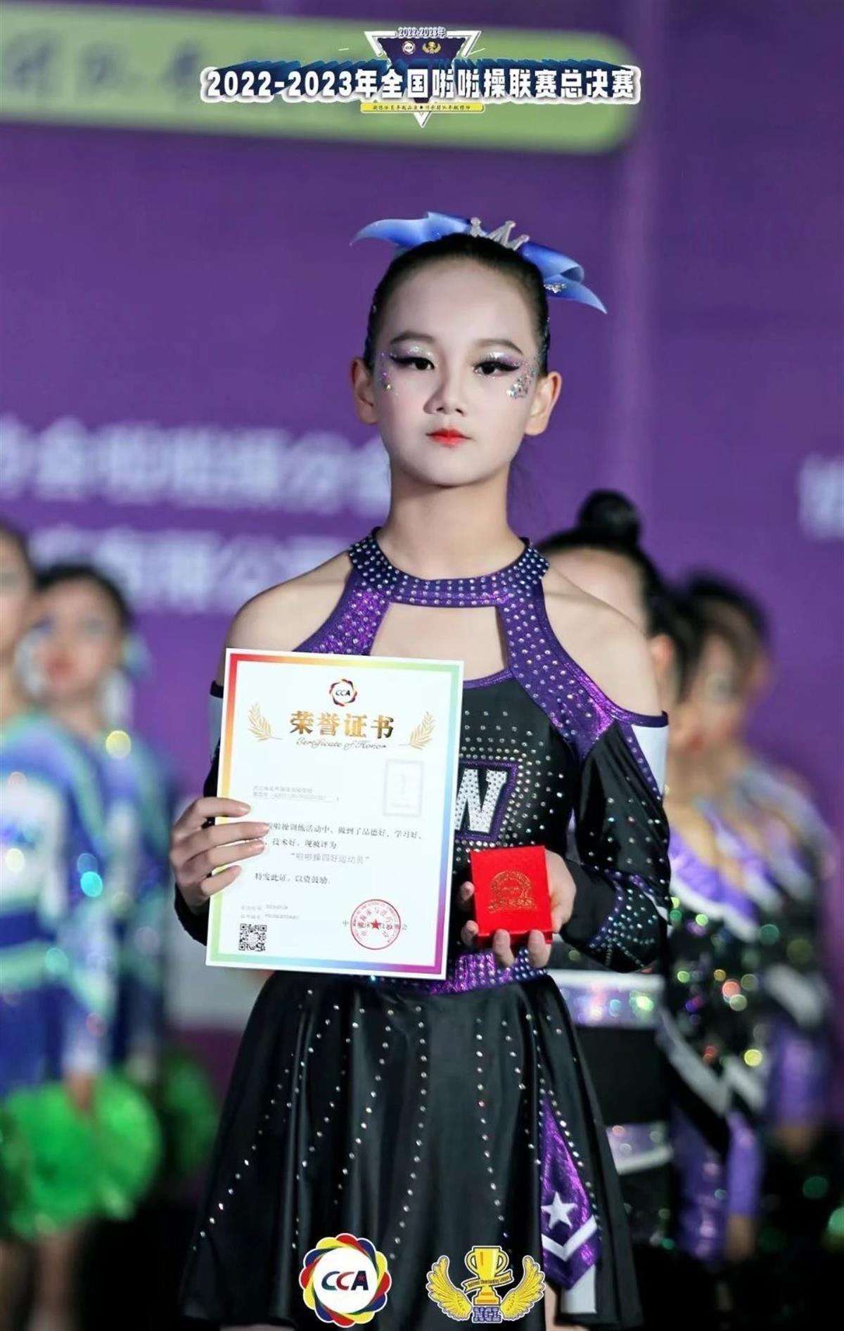 在今年7月份举办的全国啦啦操联赛总决赛中,他们获得了“公开儿童混合组—花球规定动作—1级”项目第四名、“公开儿童混合组-集体技巧2级自选动作—全女”项目第二名的好成绩。