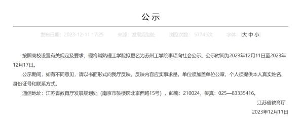 12月11日,江苏省教育厅官网发布公示称,“按照高校设置有关规定及要求,现将常熟理工学院拟更名为苏州工学院事项向社会公示。公示时间为2023年12月11日至2023年12月17日。”