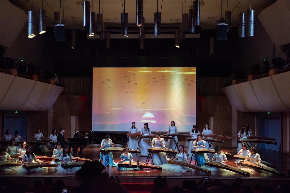 错落排列的数十位演奏者用悠扬的琴声带领观众走出城市喧嚣,走向“落霞与孤鹜齐飞,秋水共长天一色”的自然之境。