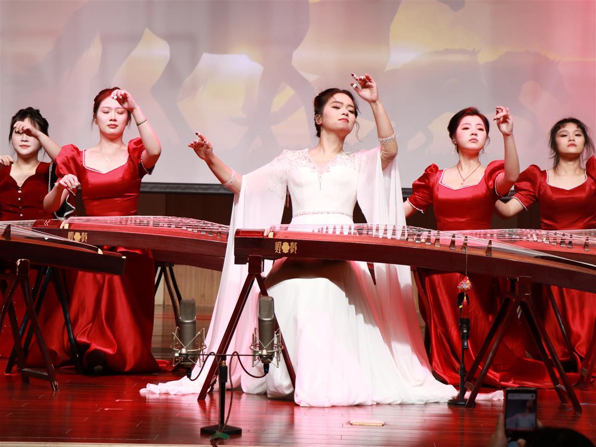 最后由16人共同协奏古筝曲《蹀马倾杯舞千秋》。回望历史长廊,千秋之节,倾杯乐响,舞马助兴,大唐盛世,好不热闹。歌唱尽曲舞罢,曲中宴会落下帷幕,演奏会也走向尾声。
