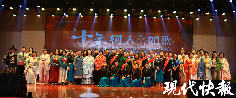 树人的老师化身历史的使者,穿梭于不同朝代,演绎独特的文化角色。特级教师、校级领导代表和骨干教师、青年教师代表们带来的《盛世国风》表演惊艳了时光,点燃了典礼现场。十年灼灼,健康生长;青山巍巍,福祚树人。最后,颁奖典礼在南师附中树人学校教职工舞蹈团带来的《高山青》表演中落下帷幕。