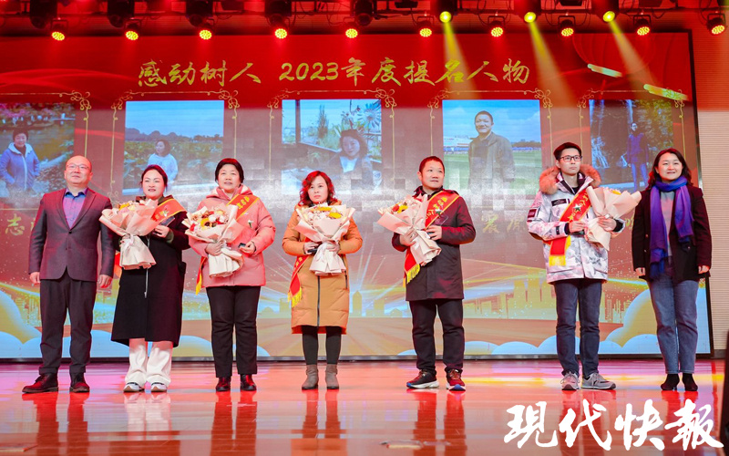 开场环节,主持人带领大家回顾了学校的发展历程:2001年,一颗教育的种子在察哈尔路37号生根发芽,历经二十二载风雨洗礼,小小的种子成长为枝繁叶茂的参天大树。2013年,南京树人国际学校从察哈尔路37号整体搬迁至现在的树人路1号,改名南京师范大学附属中学树人学校,开始步入民转公的赛道。2020年,南师附中树人校区又有了一水之隔的力人校区,如同苍树迎新,再绘雄图。现场揭晓的“感动树人”2023年度提名人物中,有不断延伸数学思维的时空,倡导内涵项目引领发展树人生态的“老将名师”教研处主任戴志鸿,有坚守“贴生而行”之道,以坚持和热情谱写教育故事的“后起之秀”叶鸣扬老师;有把英语教学和学生发展带入新境界的“乐学”课程设计师王颖婷老师;有用幽默化解方程的枯燥、用形象演绎函数的抽象的备课组长魏芬老师;有思政课程的领衔人和教研组领军者王谨业老师;有用光引领学生前行的“班主任老兵”史震虎、李爱琴老师;此外,还有世界机器人大赛金牌教练张洪伟老师和用自己的耐心和执着锻造一个又一个健康体魄的梁龙旭。