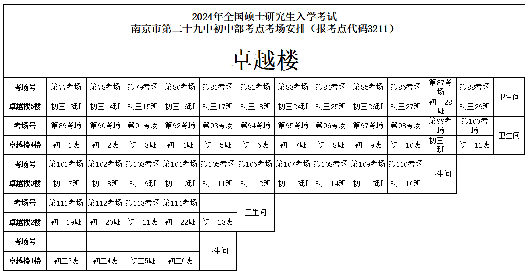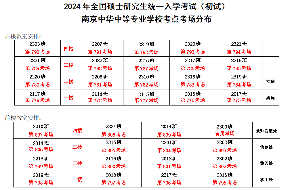 2024年全国硕士研究生招生考试将于2023年12月23日-25日举行,为确保考试顺利进行,特发布南京市招考院(3211)报考点考场安排分布图,请考生认真查看。考生可于12月22日下午4:30-5:30到现场查看考点,熟悉交通路线。研考期间天气寒冷,请考生注意防寒保暖,提前规划好出行时间及交通路线,以便顺利参加考试。