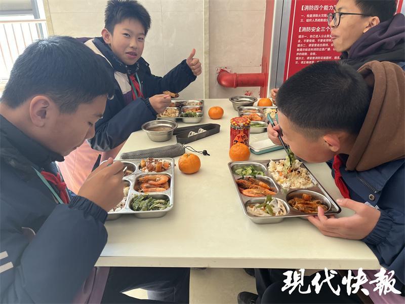 “学校的饭菜都很好吃,刚刚我又去加了蛋炒饭,只要不浪费,食堂的饭菜都可以随便添。”记者随即询问了一桌八年级就餐的学生,四名男生都吃得特别香,说起食堂的饭菜他们纷纷竖起了大拇指。