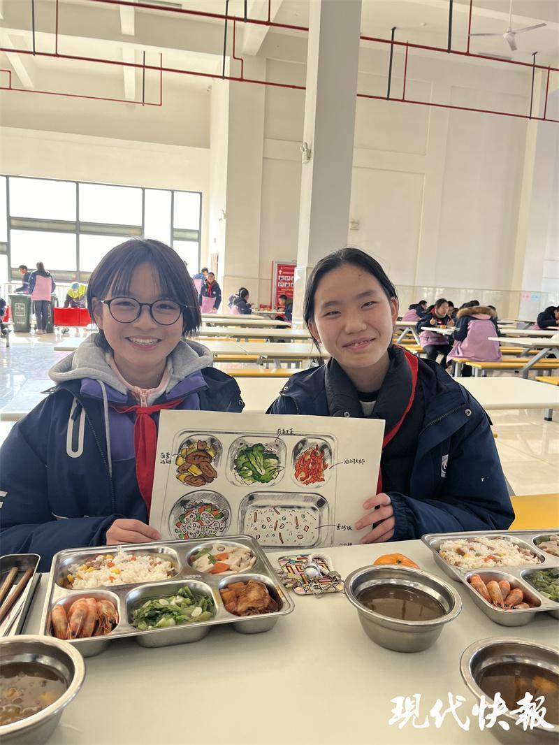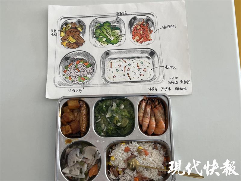 现代快报讯 (记者 陆文杰 文/摄)学生想吃什么,先用化学、地理等学科知识论证一下怎样才算营养均衡健康的一餐,然后用画笔画下来,经过师生投票确定菜谱,食堂的厨师根据学生画下的菜谱复刻出下周的午餐。日前,常州市教科院初中八(6)班高梓珺、谢秋怡等5名同学设计的午餐被学校食堂的大厨复刻后成为当天中午的营养餐,色香味俱全,营养又美味。