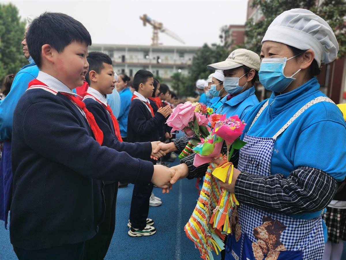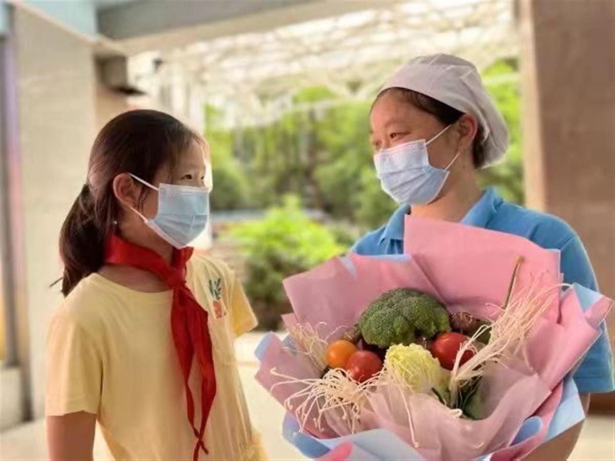 “五一”当天,同学们将暖心地垫送给师傅们,用实际行动致敬最美劳动者。有的同学还赠送了暖心礼物。制作清凉美工扇、手工精油皂、蔬菜花束等送给师傅们,并在平时主动“搭把手”,分担力所能及的事情。