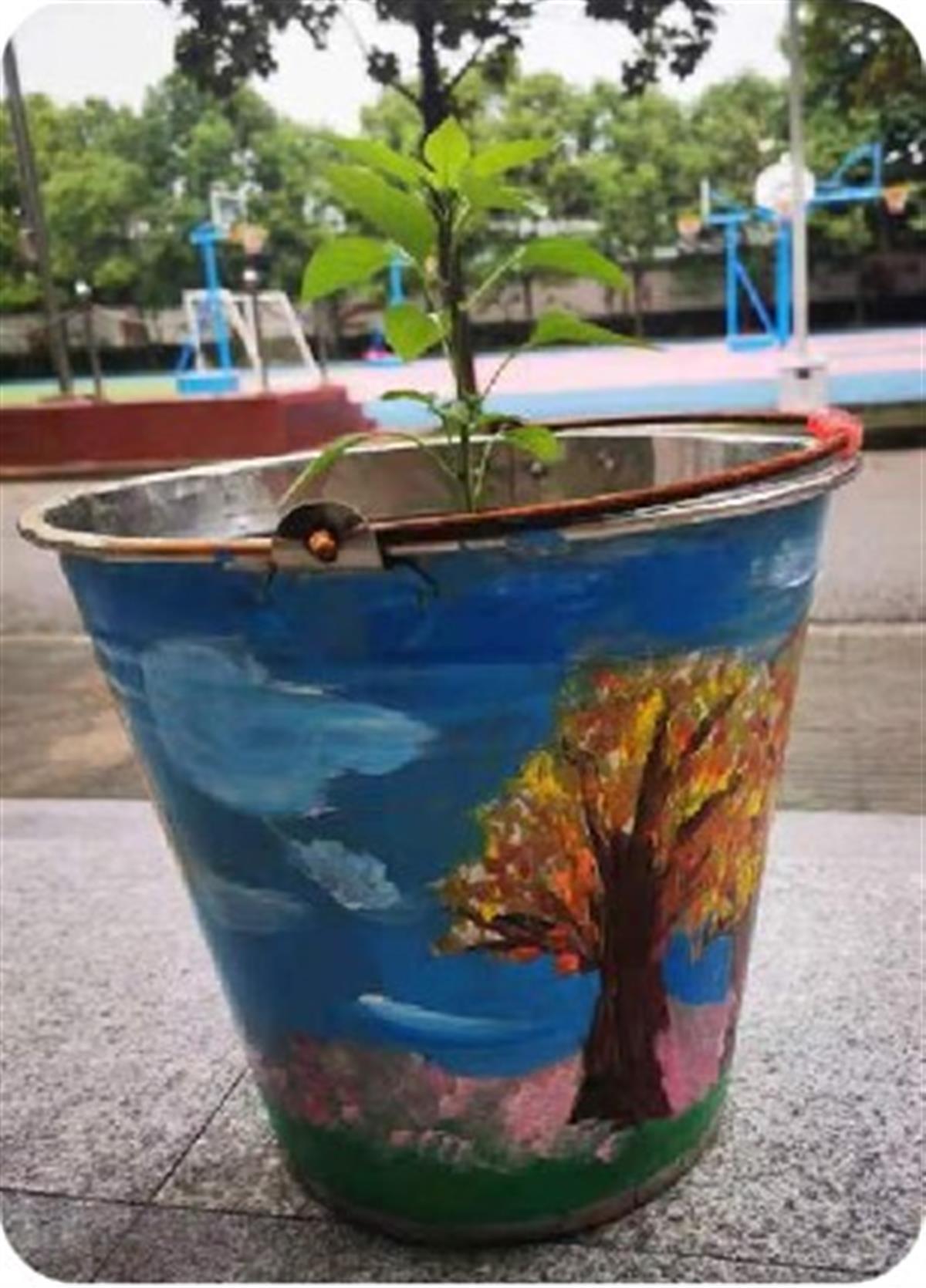 而在每年“六一”前夕,同学们又一起完成劳动菜单上的“‘嗨森’调色盘”,大家给学校的种植桶、窨井盖等老旧工具、设施绘制图案、穿上“新衣”,名画系列、卡通系列、武汉地标系列等自由选择,整个校园被装饰得焕然一新。