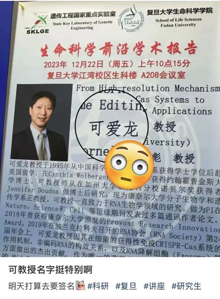 近日,有网友晒出“一位名叫可爱龙的教授在复旦大学开设讲座”的公告,获得上万网友点赞。