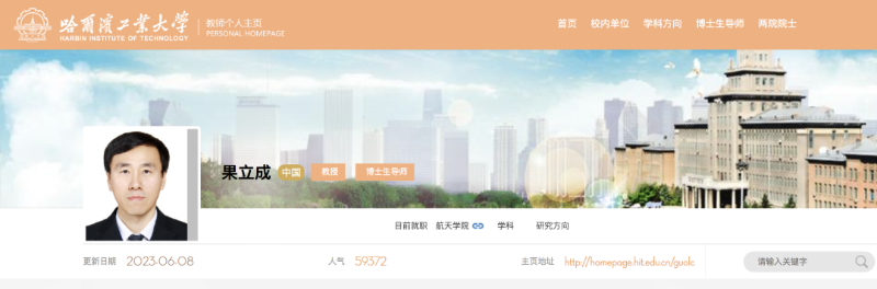 哈尔滨工业大学官网显示,果立成,男,教授,博士生导师。现任哈尔滨工业大学航天科学与力学系主任,主要从事非均匀材料断裂力学、航天航空领域复合材料及结构的破坏力学及多尺度仿真研究。
