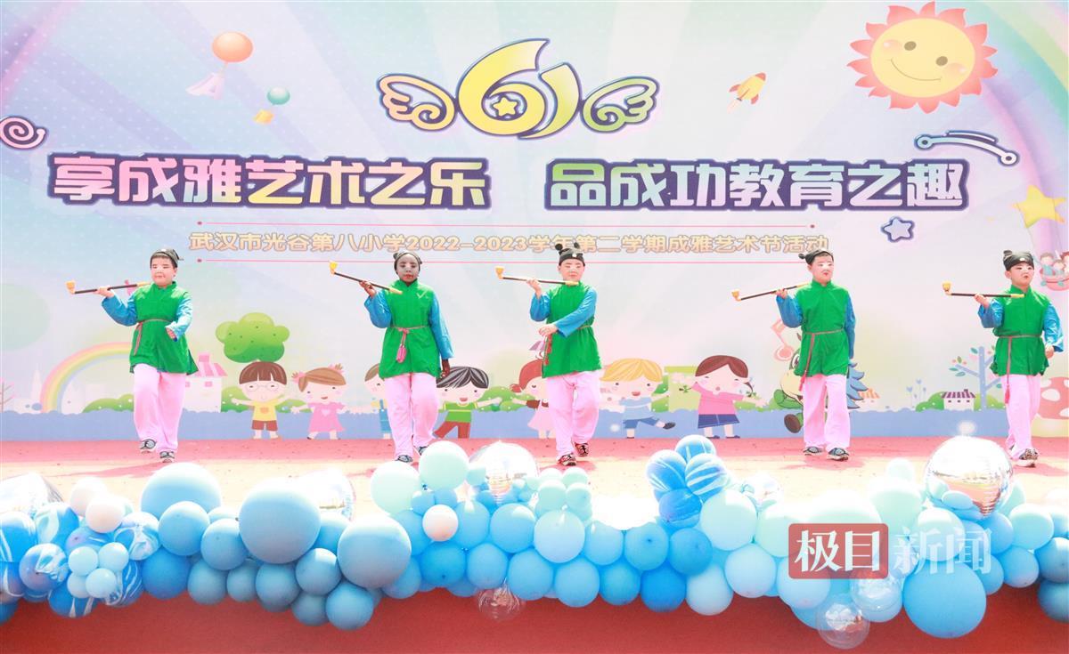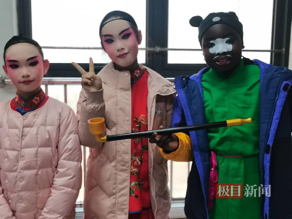 这位举着“烟袋”的“掌柜”在舞台上很气派,一边唱“地方特色风味小菜 客人满意我乐开怀”一边摆定点亮相造型。下得台来,他告诉记者:“我爸爸是加纳人,妈妈是喀麦隆人,他们现在都在武汉当老师。我在中国出生,我的汉语很好的。三年级时转入光谷八小后,听音乐老师介绍戏曲社团,我觉得很有意思,就报名了。”