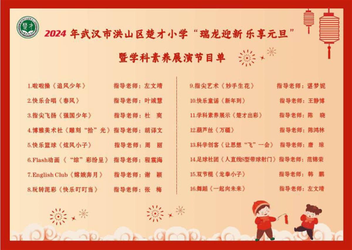 每个节日都是学生展示的舞台,辞旧迎新的元旦更是如此。12月29日,武汉市洪山区鲁巷小学二分校(楚才小学)举行“瑞龙迎新 乐享元旦”暨第五届学科素养展演活动,学生们以丰富多彩的表演方式,展示本学期所学所知及课后服务时间内解锁的新技能,共同迎接崭新的一年,表达对新年的祝福,描绘美好愿景。