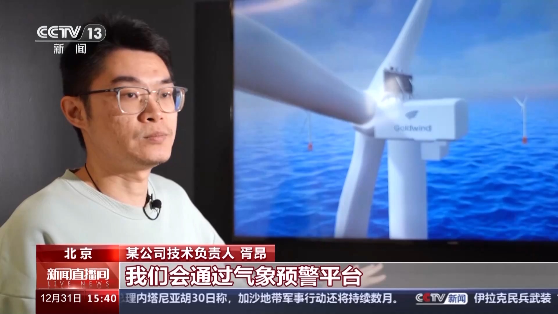 某公司技术负责人 胥昂:以海上的智能风机为例,当风机受到台风影响的时候,我们会通过气象预警平台来实时监控台风与风电场的距离和强度,通过北斗系统来提前实现风机对风角度的调整,来保证风机能够有效地应对台风的冲击。