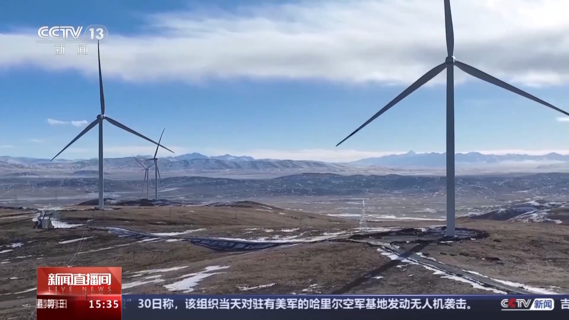 总台央视记者 张丛婧:大家通过我们的镜头可以看到,一台台风机分布在高原的各处山坡上,巨大的叶片在风中旋转,源源不断地生产着绿色电能。这里不仅有连绵起伏的雪山,还能看到,青藏铁路环绕着风电场,不时有火车经过。