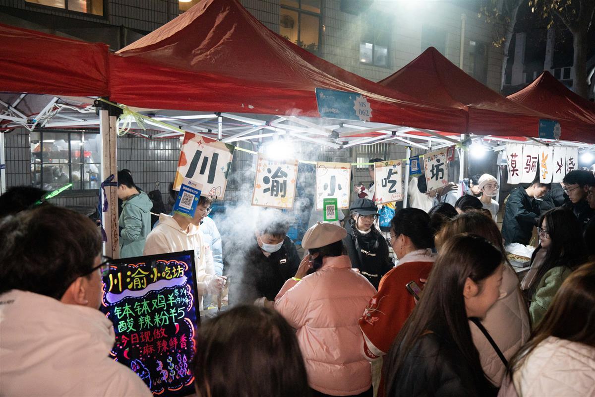 翠绿的藤椒油、火红的麻辣油、清亮的香辣油……一双双手正在装满各种蘸料的瓷碗里翻动,将一串串美味收入纸桶。“大家都太热情了,我们6点开始营业,8点就卖完了,一共卖了3500串!”美食区“钵钵鸡”摊位的团队成员、植科院研究生2201王雨千激动地表示。