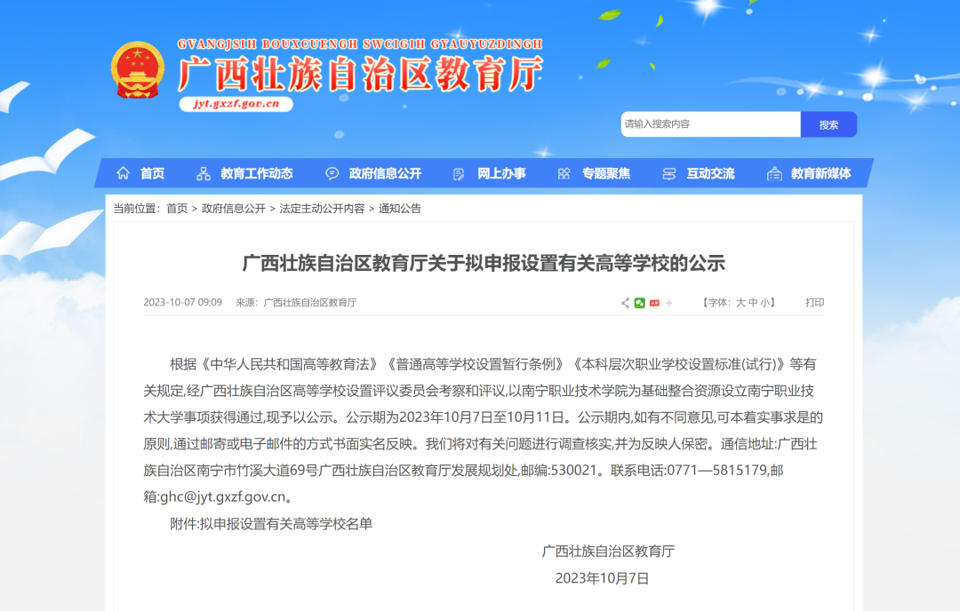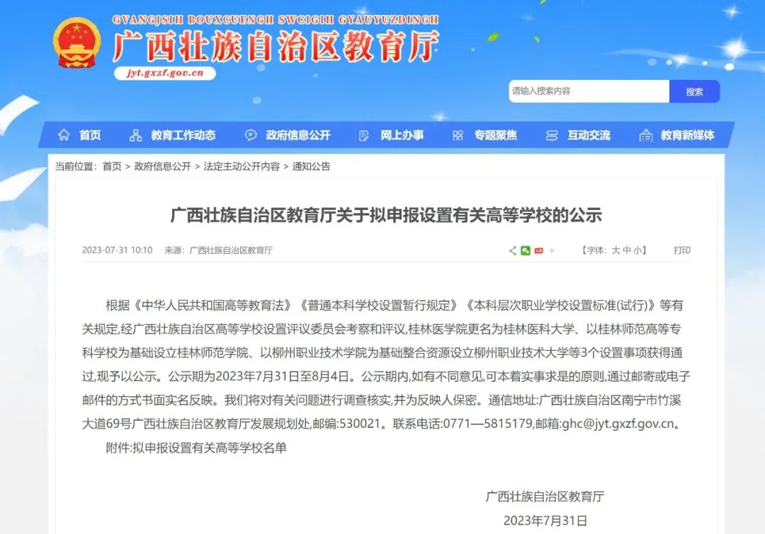 据不完全统计,除已被教育部同意更名的12所高校外,2023年获各省、市、自治区教育厅公示的拟更名本科院校还有很多,广西的桂林医学院、桂林师范高等专科学校、柳州职业技术学院、南宁职业技术学院均已进行拟更名公示。