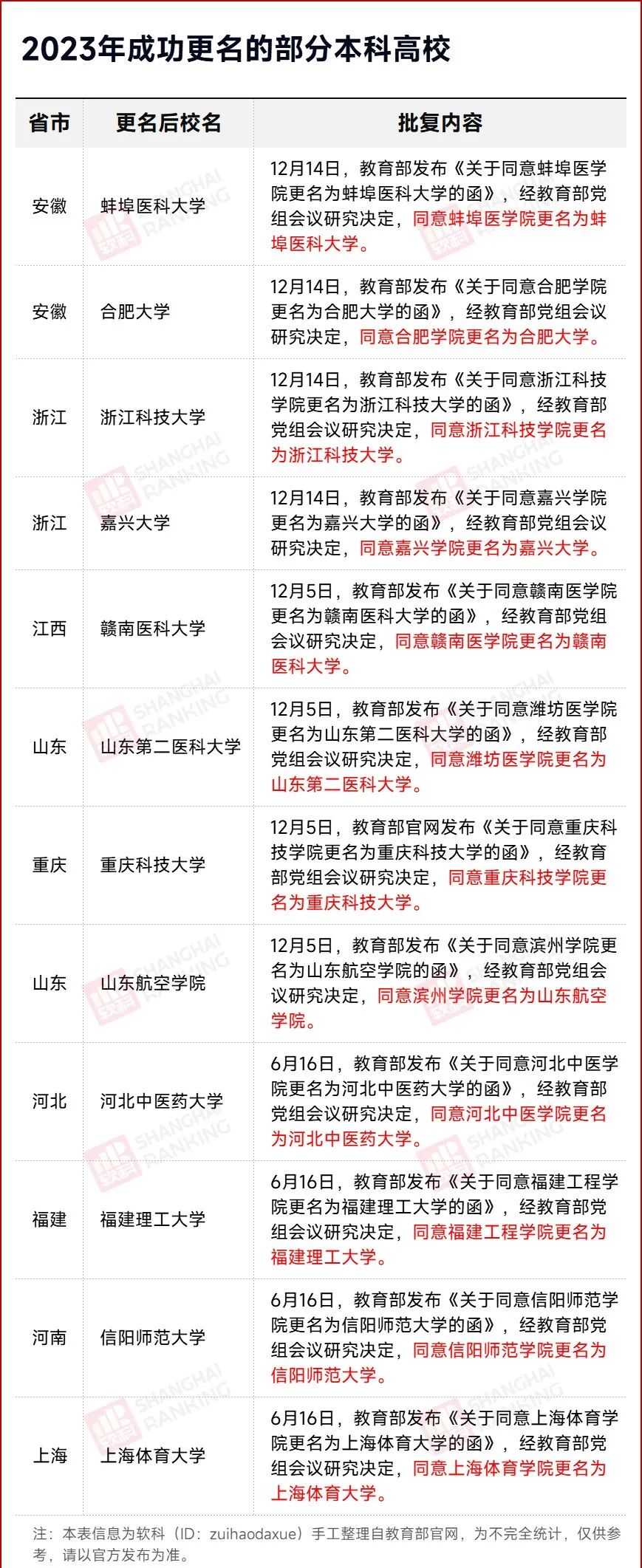 其中,安徽、山东、浙江有2所高校成功更名,福建、河北、河南、江西、上海、重庆各1所。