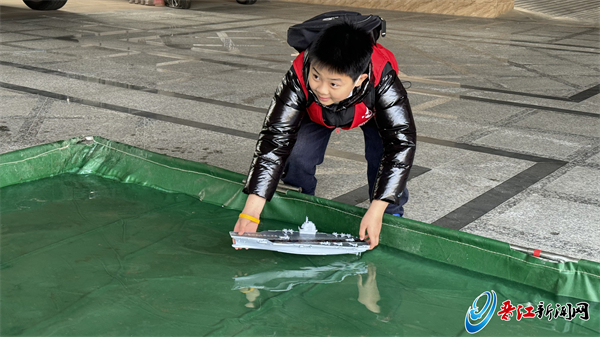 终于到了检验拼装成果的时刻。吴老师介绍,在航海模型舰船拼装直航比赛中,是以舰船的模型能否直线航行来评判成绩的。听到这里,小记者们都对自己手中的“福建舰”模型寄予厚望。在老师的指导下,他们轻轻地放入水池中。“这艘不错,开得挺稳的……”“这艘是直线航行!”看着福建舰模型缓缓驶向终点,一旁观看的家长们欢呼声此起彼伏。