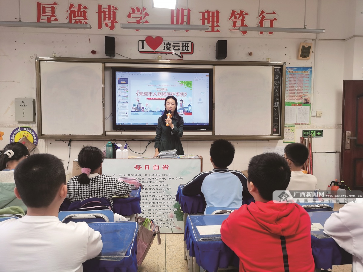 近日,南宁市秀田小学六(1)班开展“未成年人网络保护条例”主题活动,老师结合例子讲解未成年人网络保护条例有关知识。陈高丽亚 摄