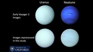 “旅行者二号”早期拍摄的天王星和海王星的原始照片(上)和新研究重新处理后的图像(下)。图片来源:帕特里克·欧文