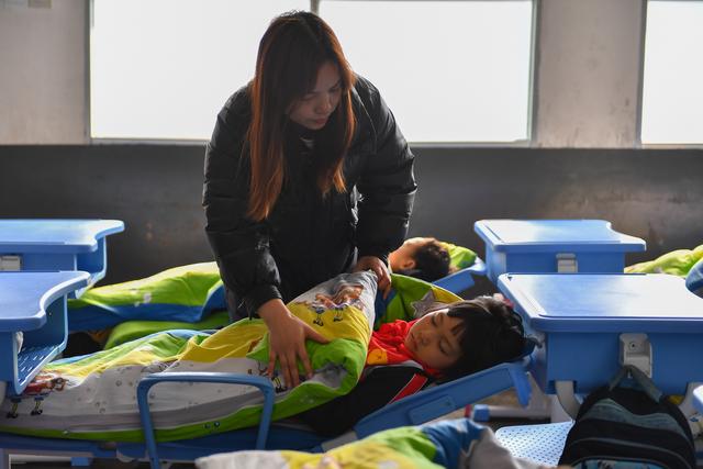 1月10日,在浏阳市龙伏镇黄桥完全小学,老师为一名在可躺式课桌椅上午休的学生盖被子。新华社记者 陈泽国 摄