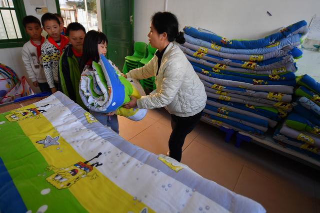1月10日,在浏阳市龙伏镇黄桥完全小学,三年级学生在午休前排队领取被子。新华社记者 陈泽国 摄