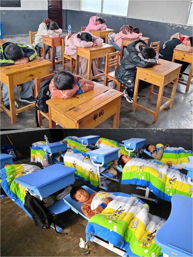 拼版照片:上图为2023年12月28日,在浏阳市龙伏镇黄桥完全小学,六年级学生趴在桌子上午休;下图为2024年1月10日,在浏阳市龙伏镇黄桥完全小学,六年级学生使用可躺式课桌椅午休。新华社记者 陈泽国 摄