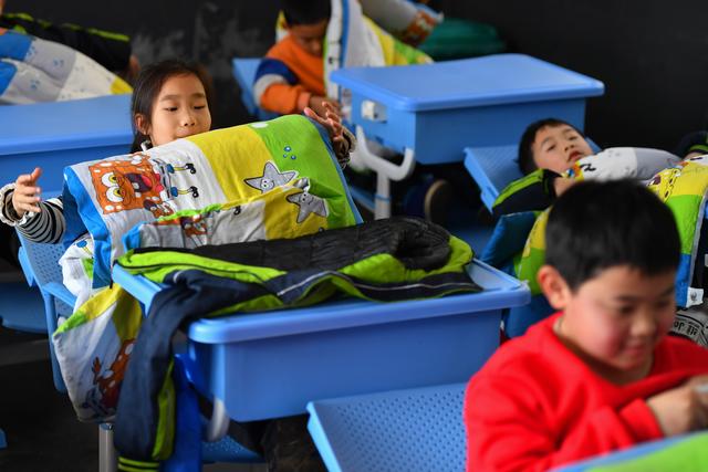 1月10日,在浏阳市龙伏镇黄桥完全小学,三年级学生在可躺式课桌椅上整理被子准备午休。新华社记者 陈泽国 摄