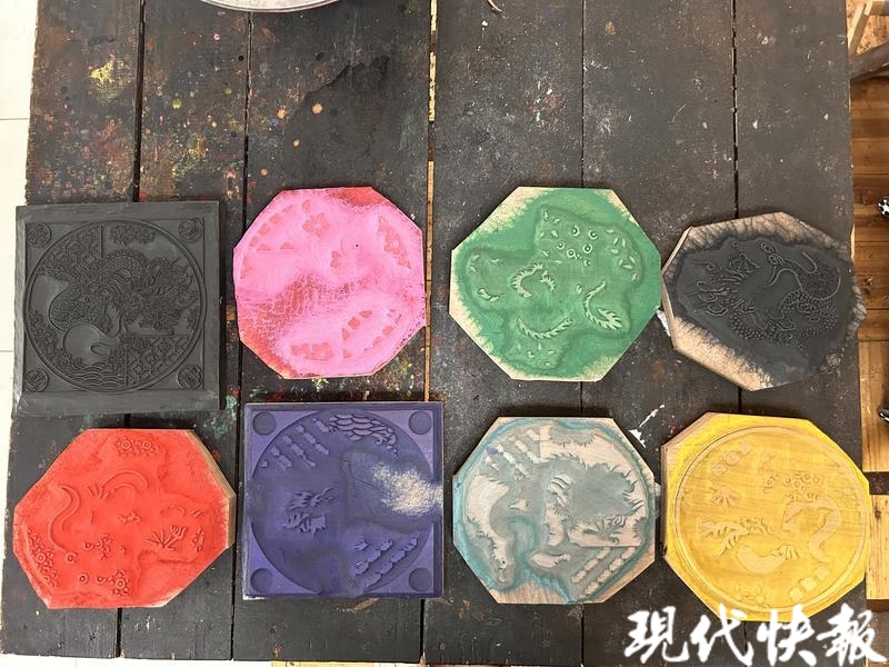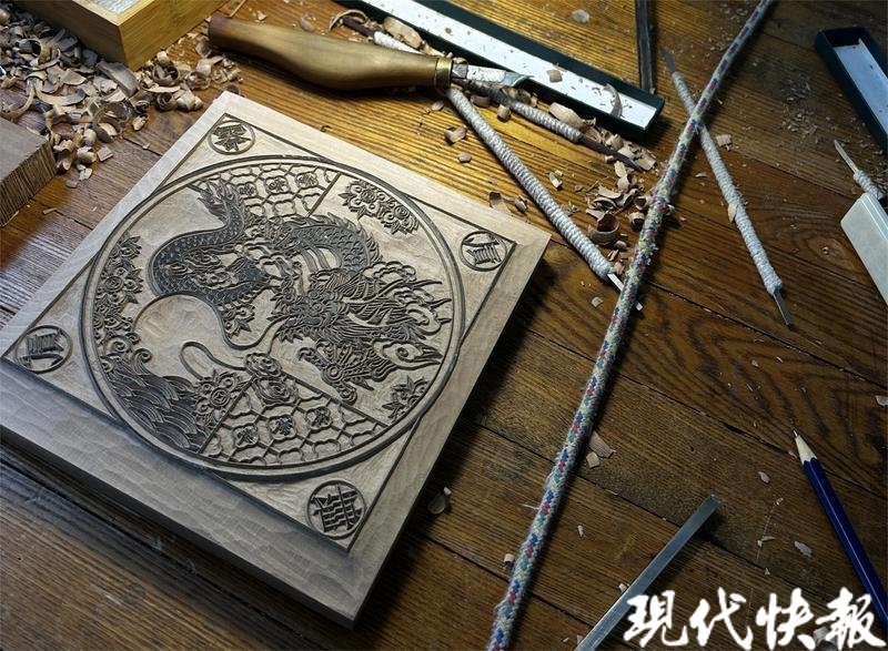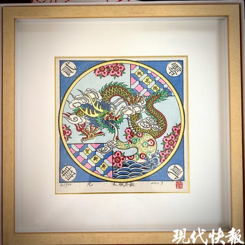 为了龙年年画,苏州桃花坞木刻年画社的“守艺人”们从兔年伊始便开始忙碌了。他们选用木制细腻的整块梨木进行雕版。刻版非遗传承人张飞帆花了一个月时间,刻出了1块线版和8块色版。“早早准备,是为了确保年画的质量和后续的推广,也预留了更多调整优化的时间。”非遗传承人孙一波告诉现代快报记者。