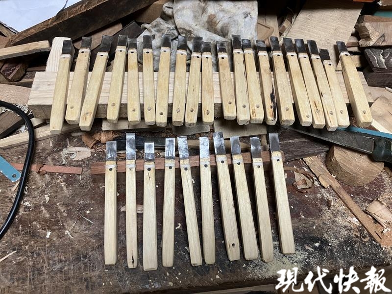 除了自学榫卯木作,他还有一个坚持了20多年的习惯,那就是刻门笺。一开始是刻“吉祥如意”“新春纳福”等吉祥话,后来开始刻生肖。“今年的龙,要不同于往年生肖玲珑可爱的形象,它应该是威严的、霸气的、粗犷的,充满力量的,有着顶天立地的气势。所以,整体的曲线设计和流畅的线条,应该突出一飞冲天的感觉。”陈和生说,龙的曲线多,为了更好地展现龙形象,他新做了30把宽窄、弧度各不相同的刻刀,精心雕镂每一个细节。