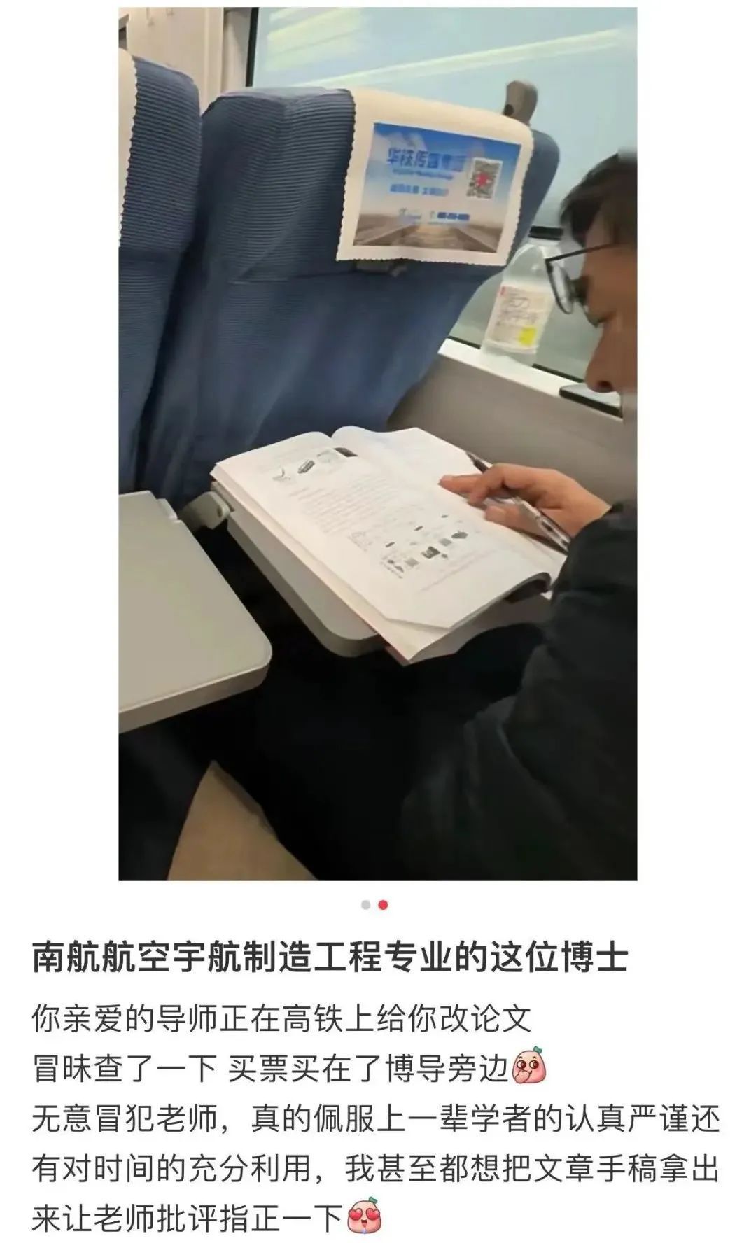 他在从山东回南京的高铁上,意外被拍下推高眼镜,详细给学生修改博士毕业论文的照片。