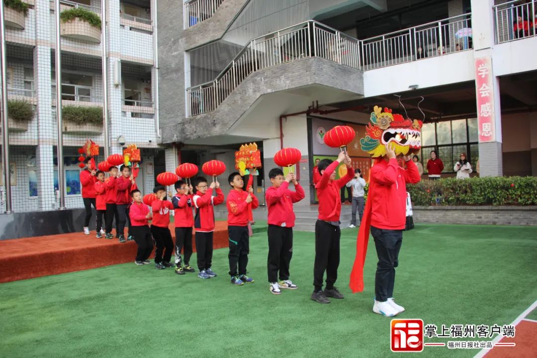 “集瑞龙、纳百福”的活动在福州市台江区滨江幼儿园开展,孩子们穿着喜庆的服装,提着自制“龙灯”参加“开学礼”。