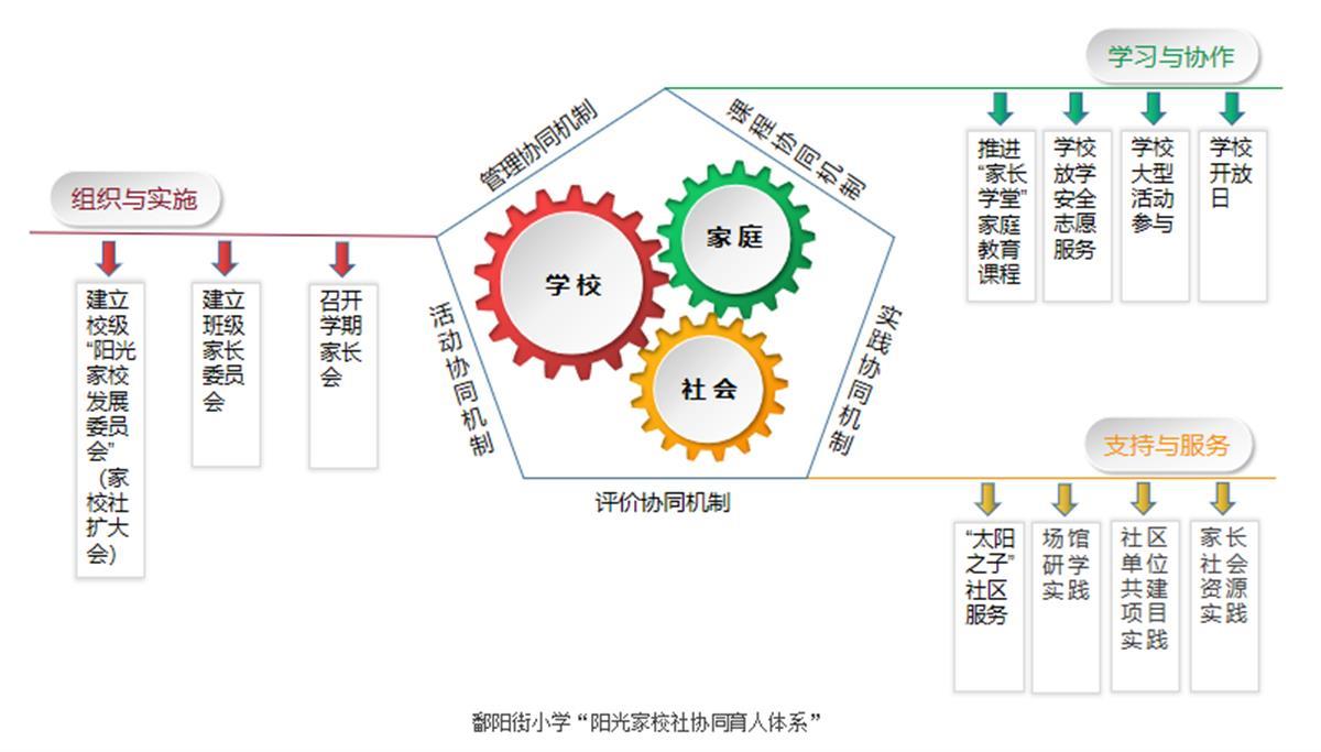 该校建构了鄱阳街小学“阳光家校社协同育人体系”模型,实现对学生成长的有效支持。在这个模型中,将学校、家庭和社会三大育人场域以齿轮式呈现,寓意三方共同助力学生的成长。以五项机制为保障,推动家校社协同育人体系高效运转。