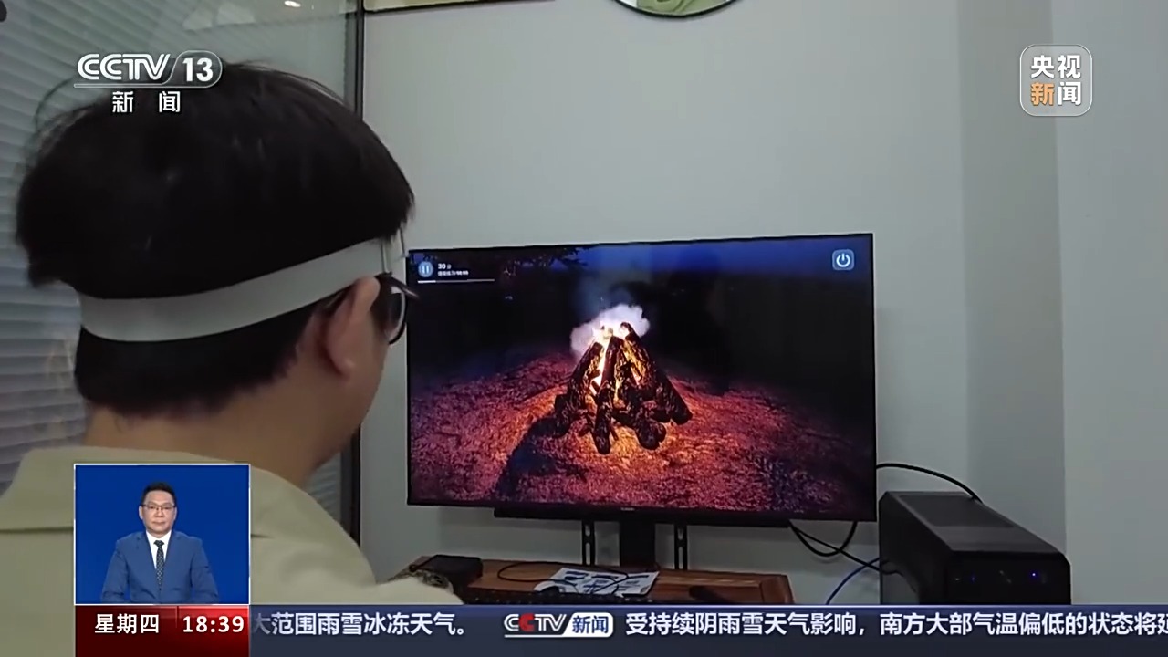 总台记者 何俊儒:现在进到了一个专注力训练的房间,我们可以试一下。这边的画面中显示了像这样篝火一个视频,通过我专注力的不断提升,这个篝火里的火苗会燃烧得越来越旺。可以看到在左上角有一个对应现在专注的分数。