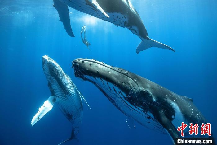 自由潜水员在3只公交车大小的幼年座头鲸中间下潜(图片来自Karim Iliya)。施普林格·自然/供图