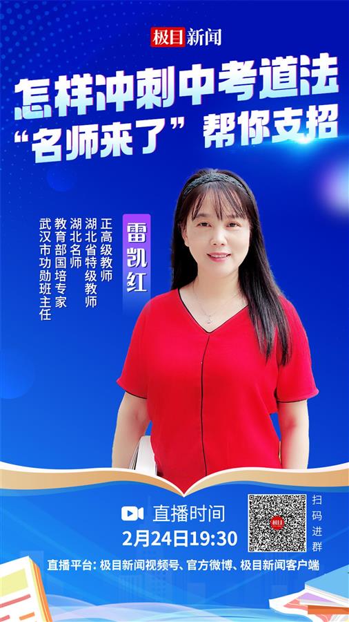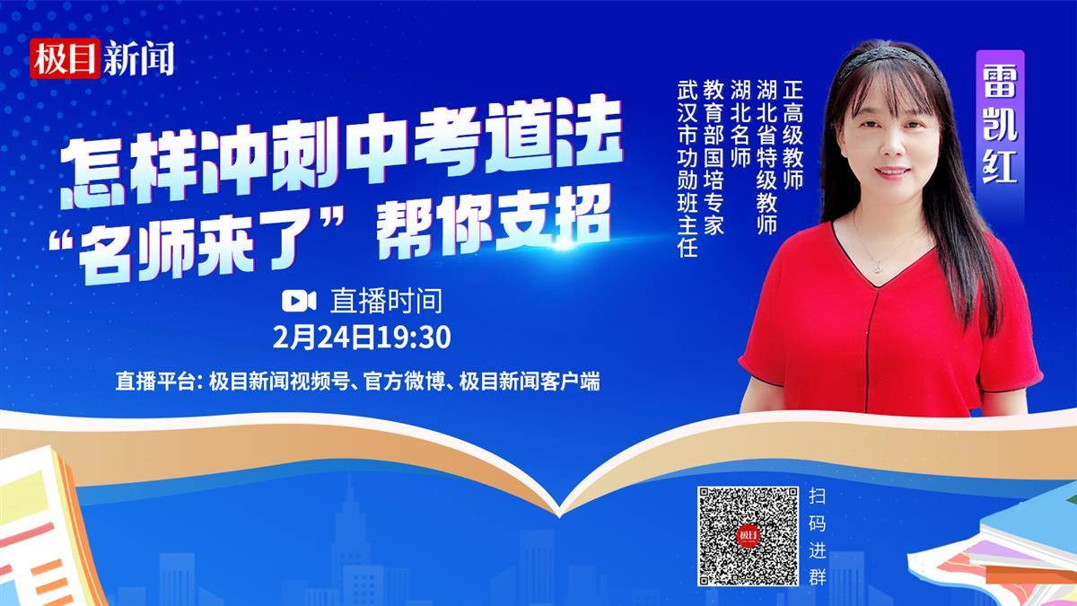 本次直播雷凯红老师将对武汉中考试题特点进行解读,并结合中考道法备考试题,给广大学子提供复习备考建议。本期节目将于2月24日19时30分,通过极目新闻视频号、极目新闻官方微博和极目新闻客户端(直播频道)等平台播出,欢迎准时收看。