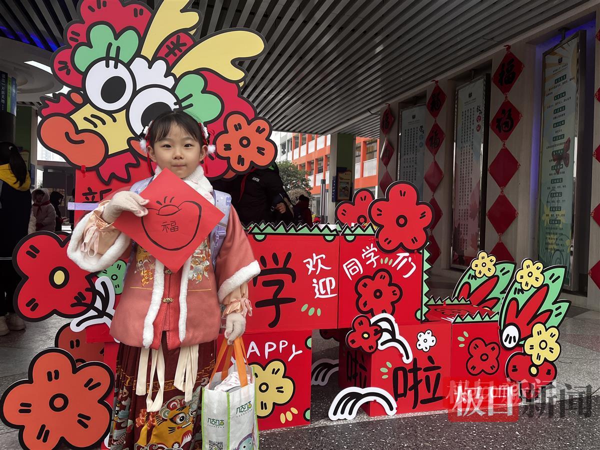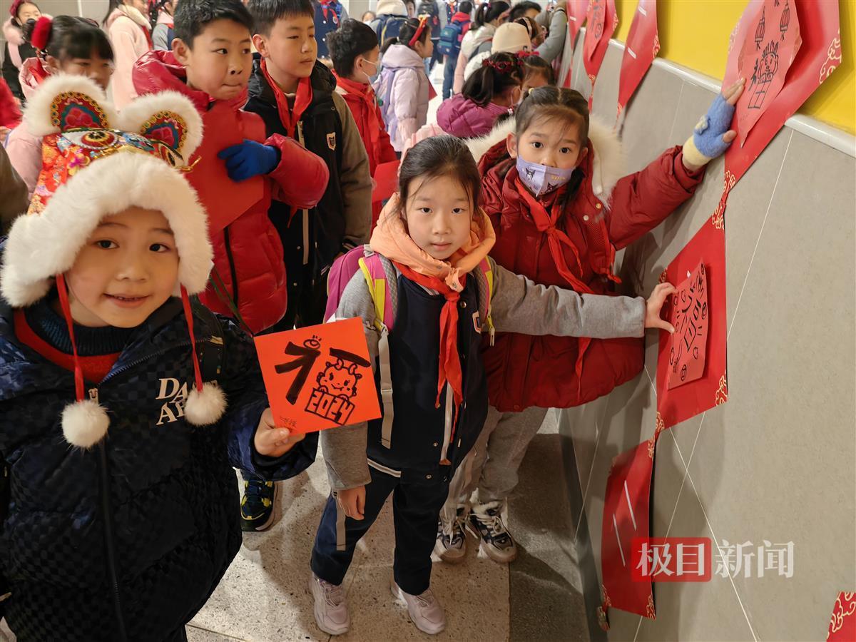 该校校长朱永军说,“迎春接福”是我国的传统民俗,让孩子们亲手写“福”,既是对新年的庆贺,也是对龙年新学期的美好祝愿。与此同时,学校还在新年开学第一课中,以“欣欣向龙”为主题,设计了“龙年成语猜猜猜”“快乐小龙分享会”和“新年祝福‘咔’一下”等几个生动有趣的活动,既提升了学生对于新学期的期待,也通过分享让师生更加心灵相通。