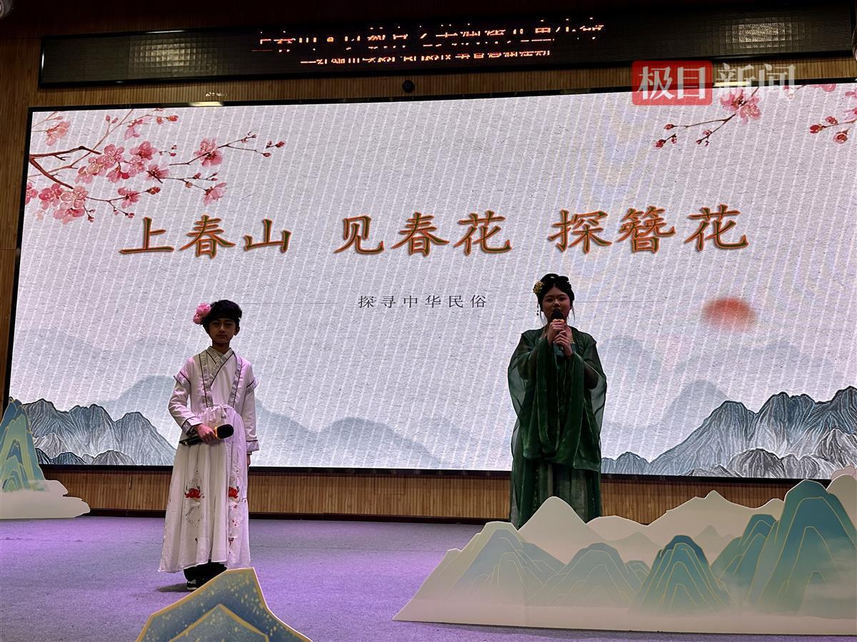 学生们通过探究发现,这一习俗在宋代就已存在,并深入探讨了其历史背景和文化内涵。学生刘俊熙、喻美伦经过一番装扮,头戴簪花进行对话,以此来体验民俗,在实践中感受了传统文化的魅力。