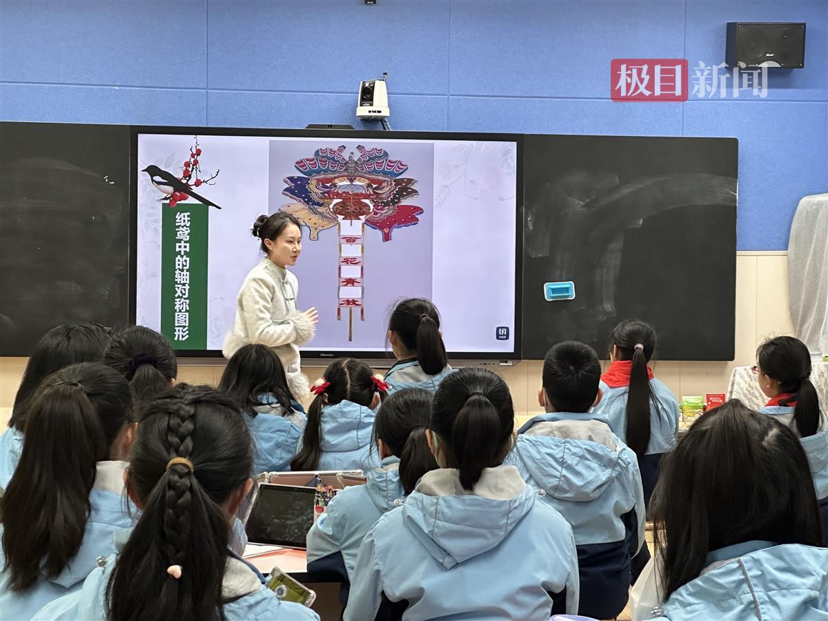 “古人在制作纸鸢时用这种中式对称构图,不仅蕴含了数学之美,也是种精神追求,东方思想注重不偏不倚、不多不少,即行中庸之道。这就要求我们待人接物保持中正平和。”张宜芳告诉学生,将此道应用于美学中,便是对称,这也是数学和美术的奇妙之处。