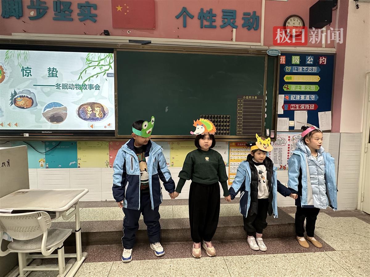 在《惊蛰物候我知道》科普展演上,一年级的学生扮演起了松鼠、青蛙、刺猬等动物,通过表演短剧,表现蛰伏了一冬的小动物们纷纷出动,尽情享受和风暖阳的场景。
